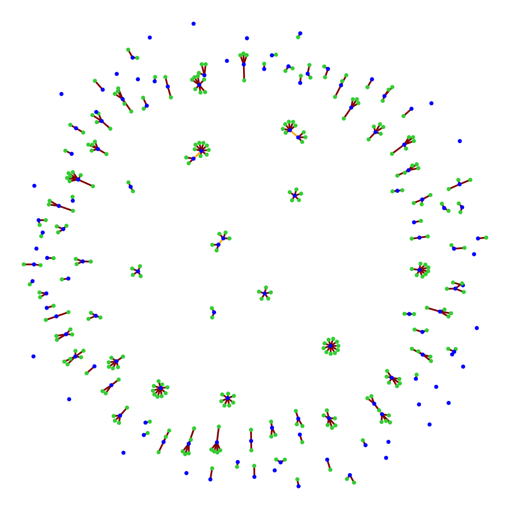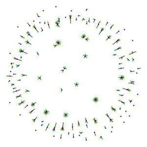 The image to the right displays a network of 428 tweets and retweets from the Evo-Div 2018 Workshop. Original tweets are displayed as blue nodes. This includes quoted retweets, since they contain a new comment. Pure retweet nodes are displayed in green. Red lines connect retweets to the original tweet. Gold lines connect quotes to the quoted tweet. Quoted tweets can, in turn, be retweeted.