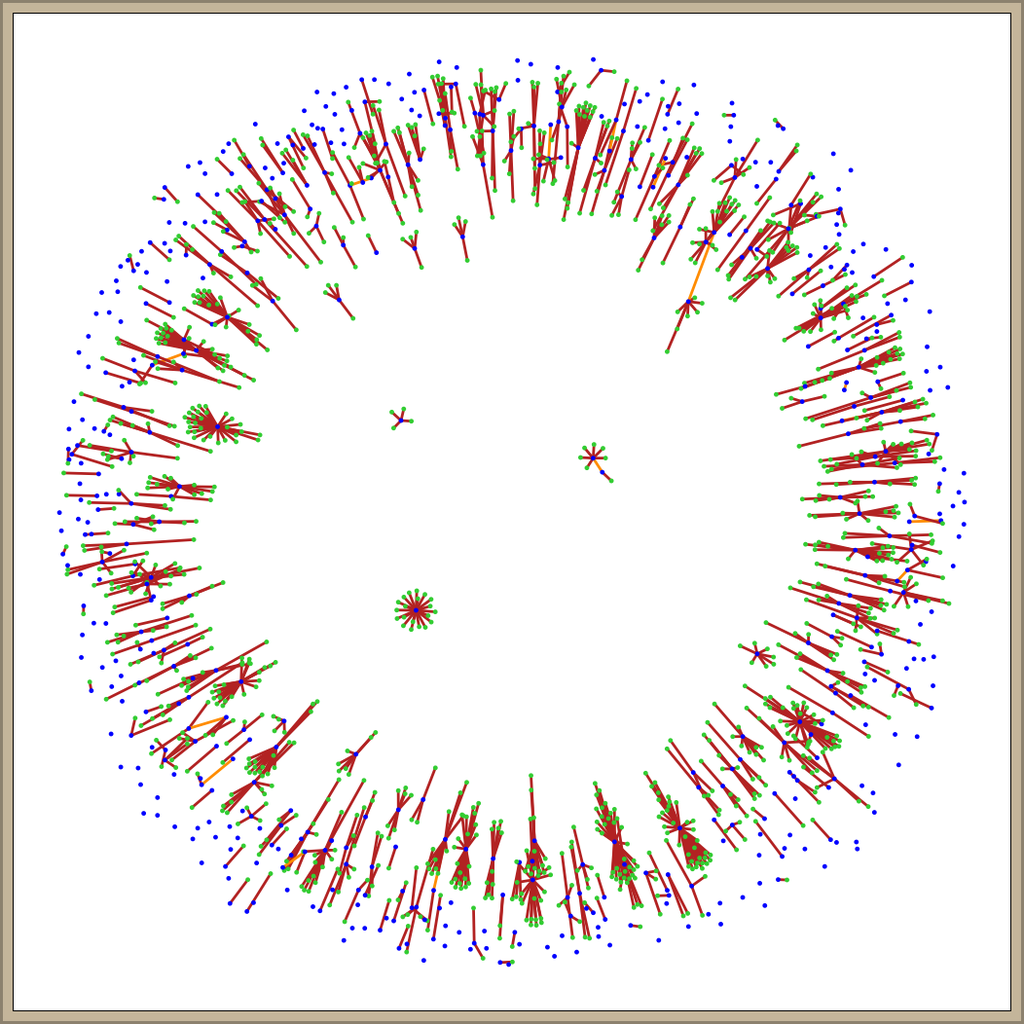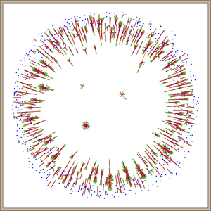 The image to the right displays a network of 1883 tweets and retweets from the Paincloud 2018 convention. Original tweets are displayed as blue nodes. This includes quoted retweets, since they contain a new comment. Pure retweet nodes are displayed in green. Red lines connect retweets to the original tweet. Gold lines connect quotes to the quoted tweet. Quoted tweets can, in turn, be retweeted.